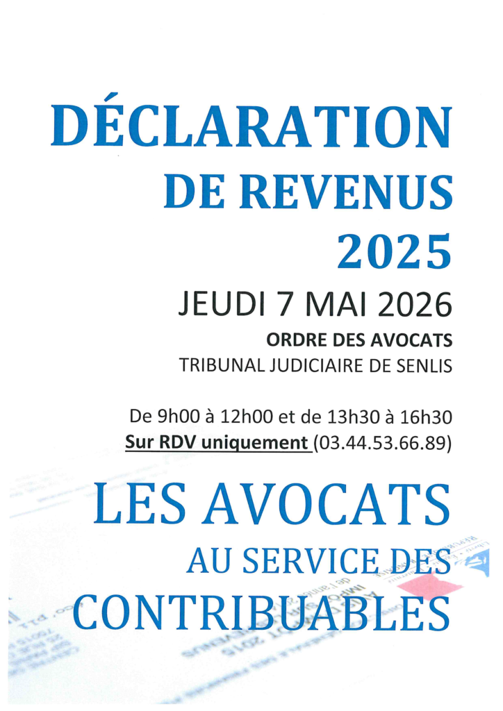 Une journée fiscalité est organisée par l’Ordre des avocats – Barreau de Senlis, le jeudi 7 mai 2026 pour les contribuables afin de leur apporter une aide pour leur déclaration de revenus 2025.